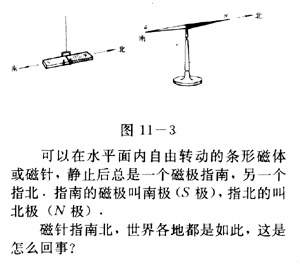 磁铁吸铁,磁针指南北.这类简单孩现象你在小学自然课里已经学过了图11-1、图11-2、图11-3至图11-4所示的现象.可以帮助你回忆起学过的知识.