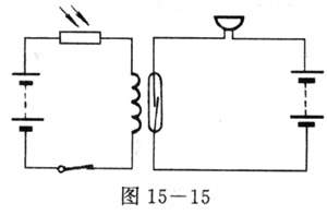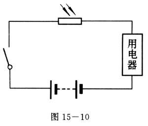 图15-10是应用光敏电阻的基本电路、电路中的光敏电阻受到光照射时,电流相当强,用电器可以正常工作.而当光敏电阻不受光照射时,阻值增大,电流减弱,用电器停地工作。下面举两个具体例子。